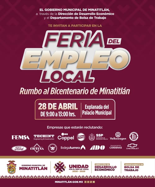 Minatitlán, Ver., 25 de abril de 2026.- El Gobierno Municipal que preside el maestro Guillermo Reyes Espronceda, a través del Departamento de Bolsa de Trabajo, te invita a participar en la Feria del Empleo Local: “Rumbo al Bicentenario de Minatitlán”.
