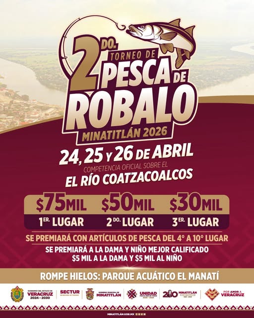 Minatitlán, Ver., 13 de abril de 2026.- El Gobierno de Minatitlán que preside el maestro Guillermo Reyes Espronceda, invita a participar en el 2º Torneo de Pesca de Róbalo Minatitlán 2026.